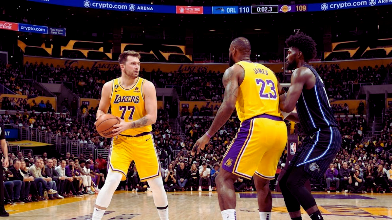 [Image Placeholder: Luka Doncic passing the ball back to a heavily guarded LeBron James]